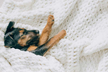 Dog breed yag-terrier on light background. A small puppy, pet, lies in fluffy soft blanket, hid in blanket.