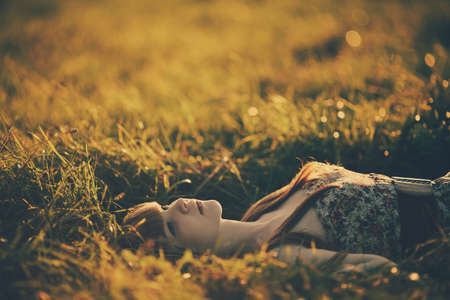 A young woman with long brown hair is lying on her back in a field of grass. She is wearing a yellow shirt and has sunlight on her face. She is looking directly at the camera with a soft, calm expression. The image has a warm, natural feel.