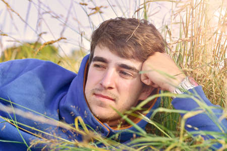 Man lying on green grass wearing check shirt, blue jeans at a park and looking on the sky on summer day