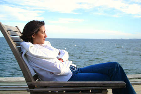 Young woman relaxing on pier. laying on the pier and watching in the sky. listening some music