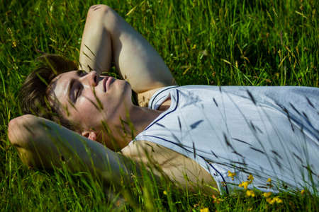 Handsome young man lying on the ground and relaxing in the park with his eyes closed