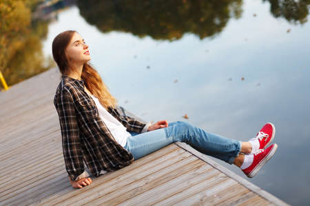 Young woman in casual clothing resting and looking on sky outdoors on wooden bridge portrait.