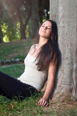 Young brunette girl taking a nap outdoor with red and black clothes and a hand watch
