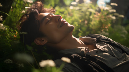 A tranquil young man with closed eyes rests his hand on his face, sitting comfortably amidst lush green tropical foliage. He embodies a moment of calm, relaxation, and mindfulness in nature.