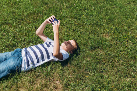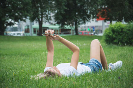 girl lies in the park on the grass and takes a selfie on her smartphone