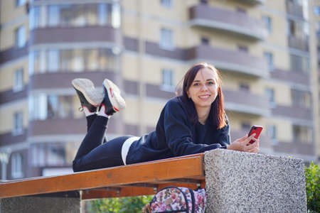 Girl lies on bench with phone in her hands. Young woman is resting in the park on the bench
