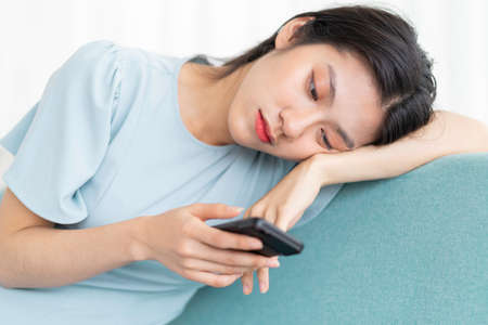 Dark-haired woman dressed in black lying on black sofa with phone in her hands upset after reading bad message and experiencing negative emotions possibly grief, stress, loneliness, loss, fear