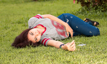Top view of a woman with headphones listening to music and smart phone lying on the grass of a park, on a sunny day.