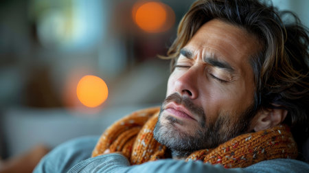 Close-up of a contemplative man with eyes closed, wearing a warm knit scarf. The image evokes feelings of introspection and comfort in a cozy indoor setting.