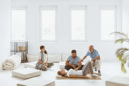 Therapist man doing Holistic therapy Reiki to a woman. Energy treatment with the heat of the palm hands. Japanese energy healing. Wellness, health, relaxation, well-being and alternative medicine concept.