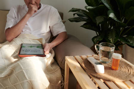 young brunette girl with long hair, sick lying on the sofa in her house taking medicine and an infusion
