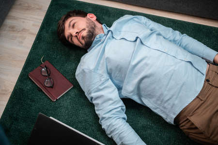 Young cute office worker lies on the floor mat next to the sofa, he is tired and asleep, top view