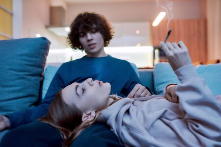 Beautiful young woman smoking marijuana joint while relaxing with boyfriend on the sofa at home. Selective focus