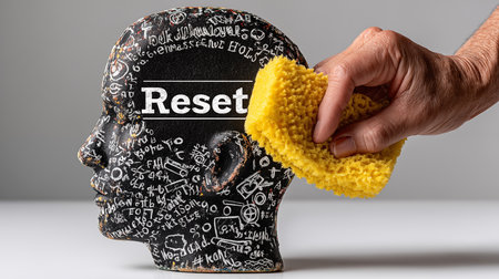 A woman with dark hair is resting her head on her hand at a desk. She appears tired, surrounded by a contemporary office backdrop and greenery. The warm lighting adds a calm atmosphere.