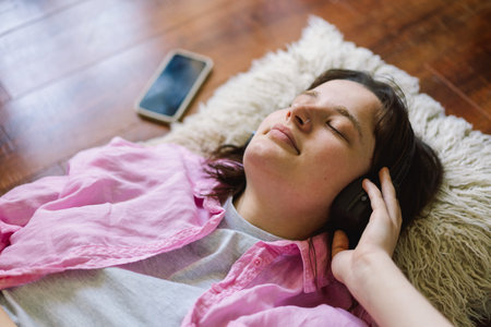 The top view of picture that about young scandinavian human that laying down and listening to the music and focused in the full of the thought and music with room that surrounded with devices. AIGX03.