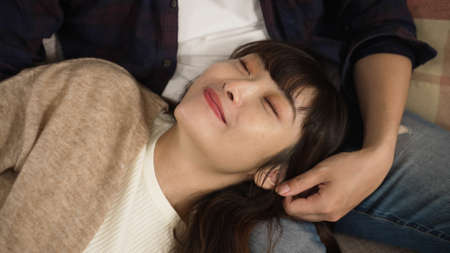 closeup of a happy asian female lying on her boyfriend’s laps with a smiling face to enjoy his gentle touch on the hair in the living room at home