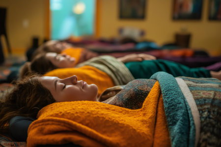 People lying on mats covered with blankets, enjoying deep relaxation during yoga nidra session