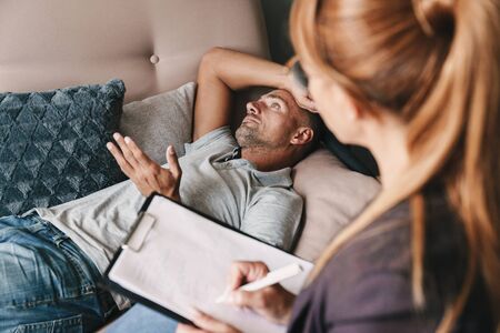 Photo of confused caucasian man lying on sofa and having conversation with psychologist on therapy session in room