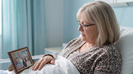 Elderly woman resting in hospital bed gazing at framed family portrait, reflecting on loved ones and support during medical recovery.
