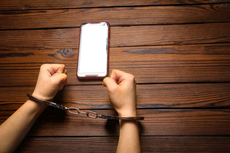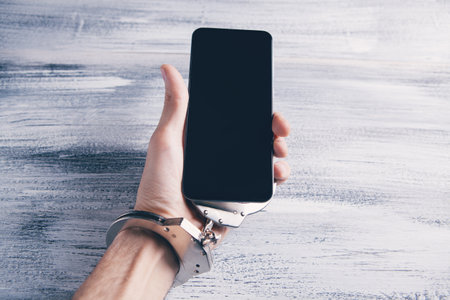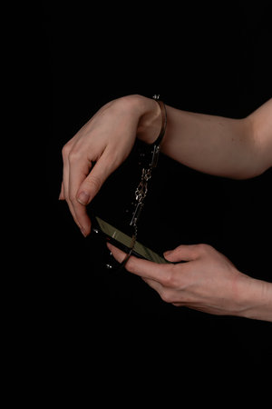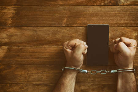 Hand of woman attached to smartphone with handcuffs