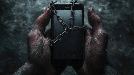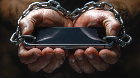 This striking image features a pair of hands grasping a smartphone that is tightly bound in chains. The dark and moody atmosphere creates a sense of isolation and struggle, symbolizing the tension between technology and personal freedom.