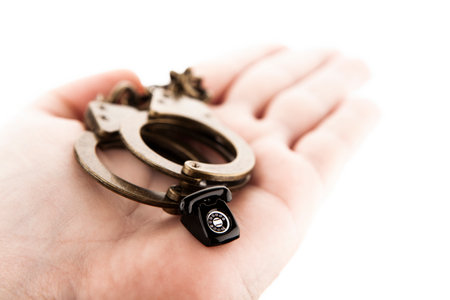 Handcuffs on the palm of a man isolated on white background