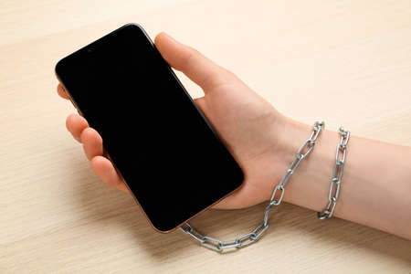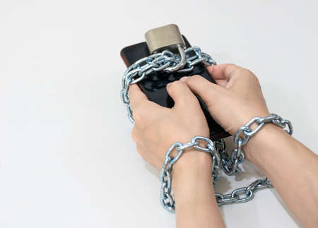 Iron chain ties together hands and smartphone - mobile phone addiction concept