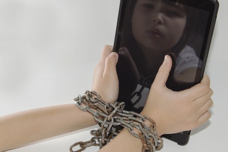 Chained hands of child holding smartphone on table. Phone concept of internet addiction and drug