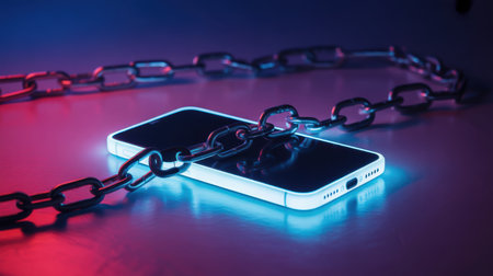 A metal chain is wrapped around a white smartphone. The scene is illuminated with neon blue and red lighting, casting reflections on the surface. The chain is in focus on the phone, with more of the chain extending into the blurred background.