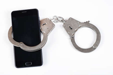 Phone in the Handcuffs on the White Background closeup