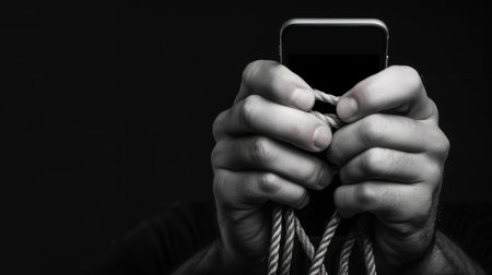 A dramatic monochrome image featuring hands firmly holding a smartphone entwined with a rope, symbolizing the feelings of restriction and confinement in the digital age.