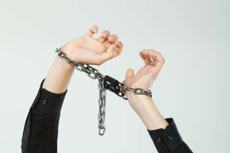 Arrest the offender,Male hands with chains and key around the wrists on a gray background