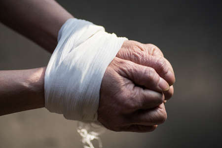 A closeup of tied hands of a middle-aged woman on a blurred gray background