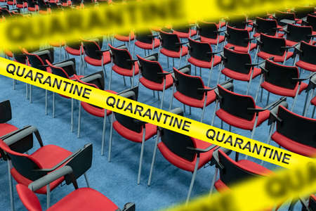 An empty room with rows of chairs behind a yellow tape marked Quarantine. Ban on visiting public places. Self-isolation mode due to coronavirus. Restrictions to prevent the spread of the disease.