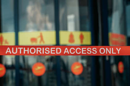Authorised access only sign in front of airport doors. Travelling during coronavirus pandemy outbreak