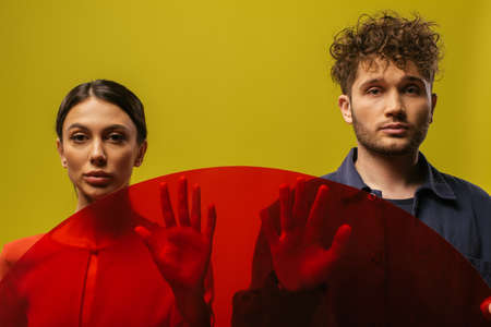 Paper cups laid out in the form of a pyramid, with the image of the symbols of the little man. Blocked by a barrier tape. Yellow background. The concept of business management and career.