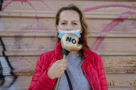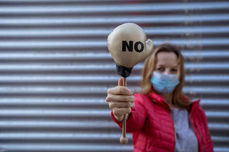 Young woman in protective sterile medical mask on her face, on street background, holding small boxing glove with No sign. America president election, pandemic virus concept.