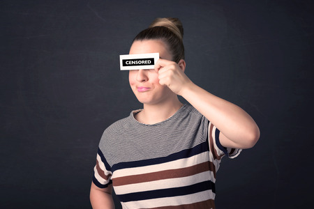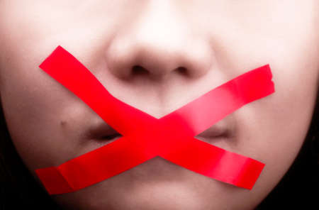 Concept on the topic of freedom of speech, censorship, freedom of press. International Human Right day: the girl's face is sealed her mouth with black paper