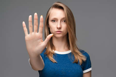 Serious girl with blonde straight hair in blue t shirt shows a stop with her hand, gesturing finish, showing symbol of rejection, not allow violence, body language.