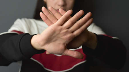 The young girl, crossing her arms, shows a forbidding gesture. Stop domestic violence.