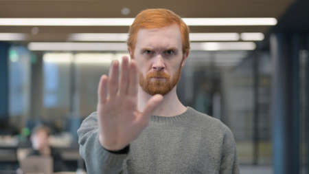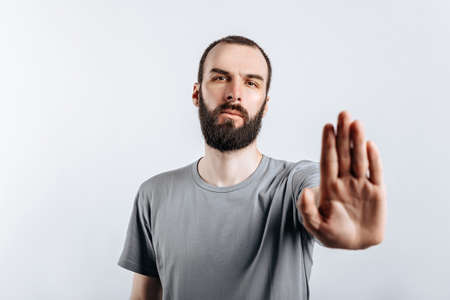 Confident fearless Caucasian man makes stop gesture, palms forward and looks seriously into camera. Studio, gray background.