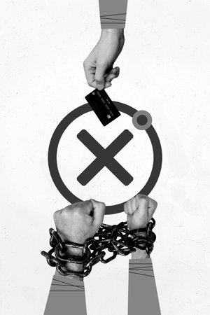 Vertical photo collage of hands hold credit card forbidden payment cross handcuffs prisoner ebank money isolated on painted background