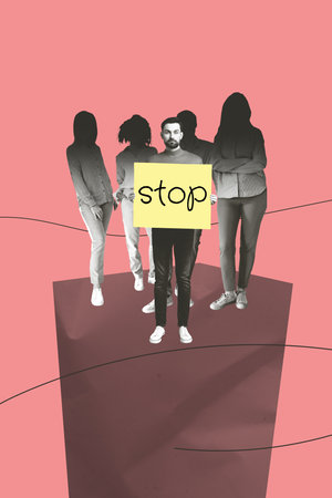 Creative composite sketch artwork collage of crowd young man stand hold banner stop feminism power equality rights protest vote strike