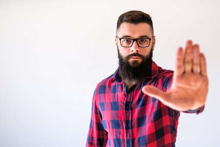 Portrait of handsome young man frowning while looking at camera holding hand opposite and saying stop gesture on white background with space for advertisement mock up