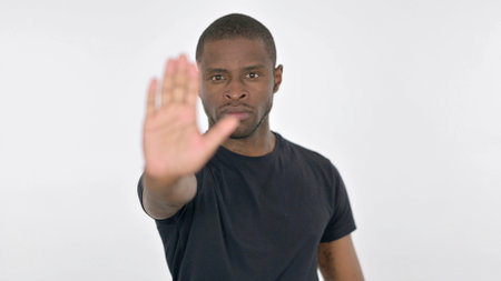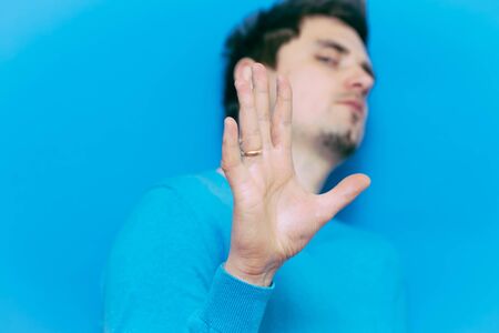 Stop gesture. Rejecting man. Warning sign. Racial tolerance. Serious strict guy showing outstretched hand refusal isolated on blue studio background.