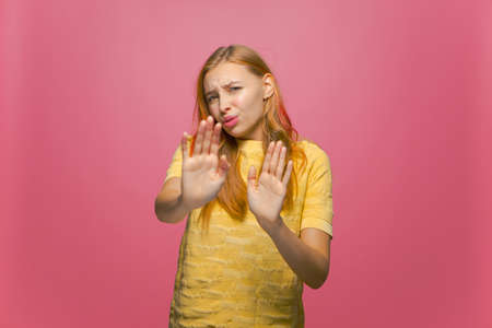 No, enough. Displeased young girl show stop gesture, demanding to cease on pink background. Quarrel, dispute, conflict