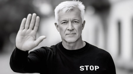 Mature man with gray hair showing open palm gesture and STOP on shirt