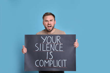 Emotional young man holding sign with phrase Your Silence Is Complicit on light blue background. End racism