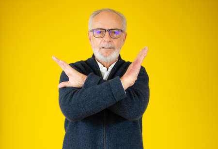 Grey bearded hair senior over yellow background Rejection expression crossing arms and palms doing negative sign