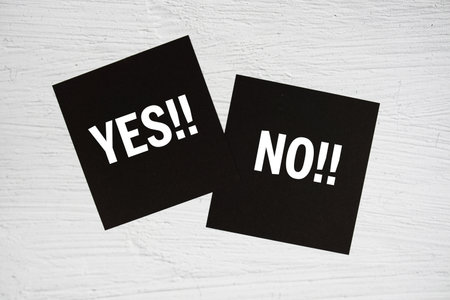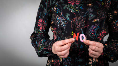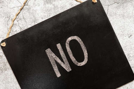 Fragment of a chalk slate black board with the words no, concept of denial, negative, communication, choice, decision making, refusal.